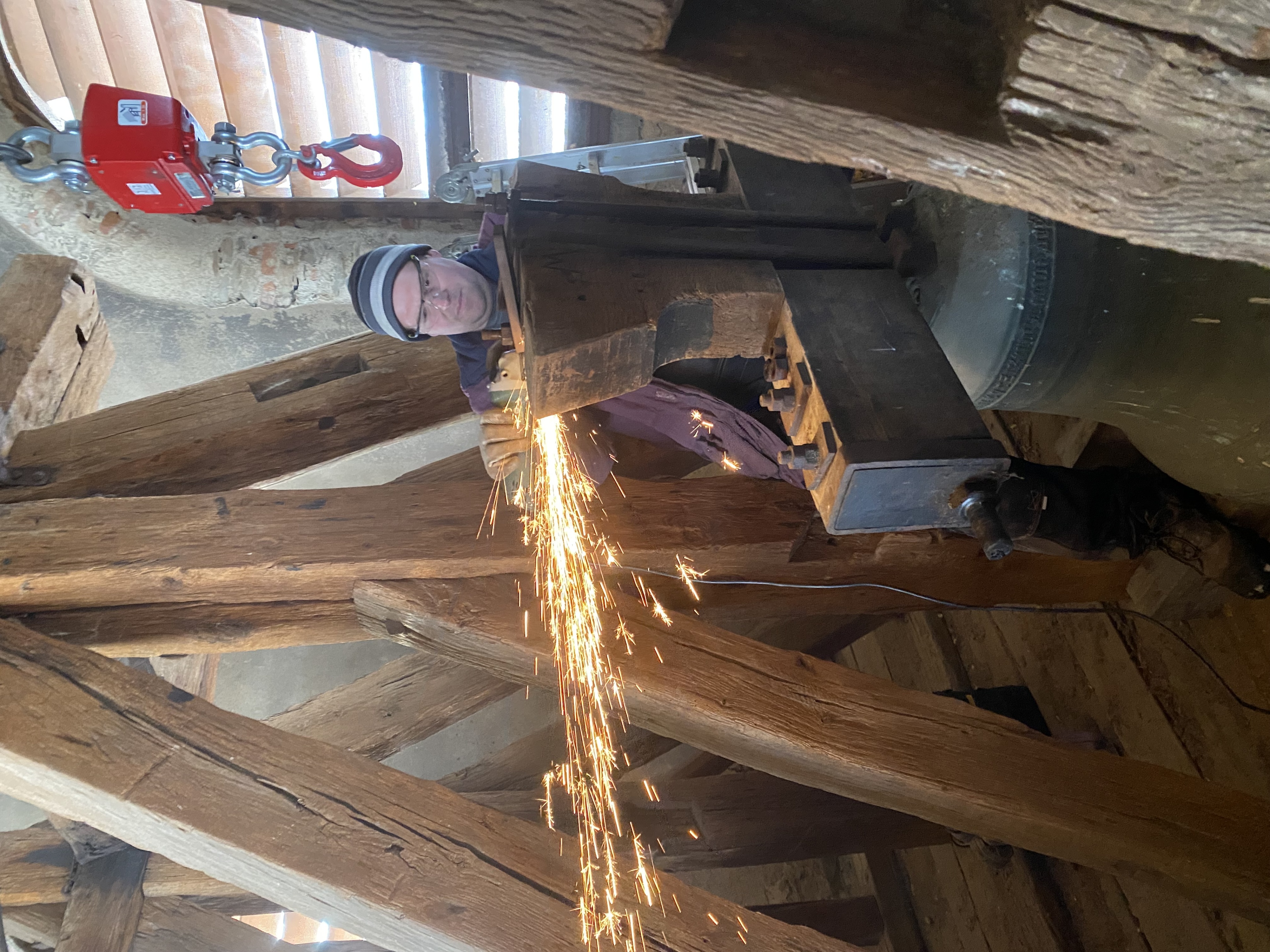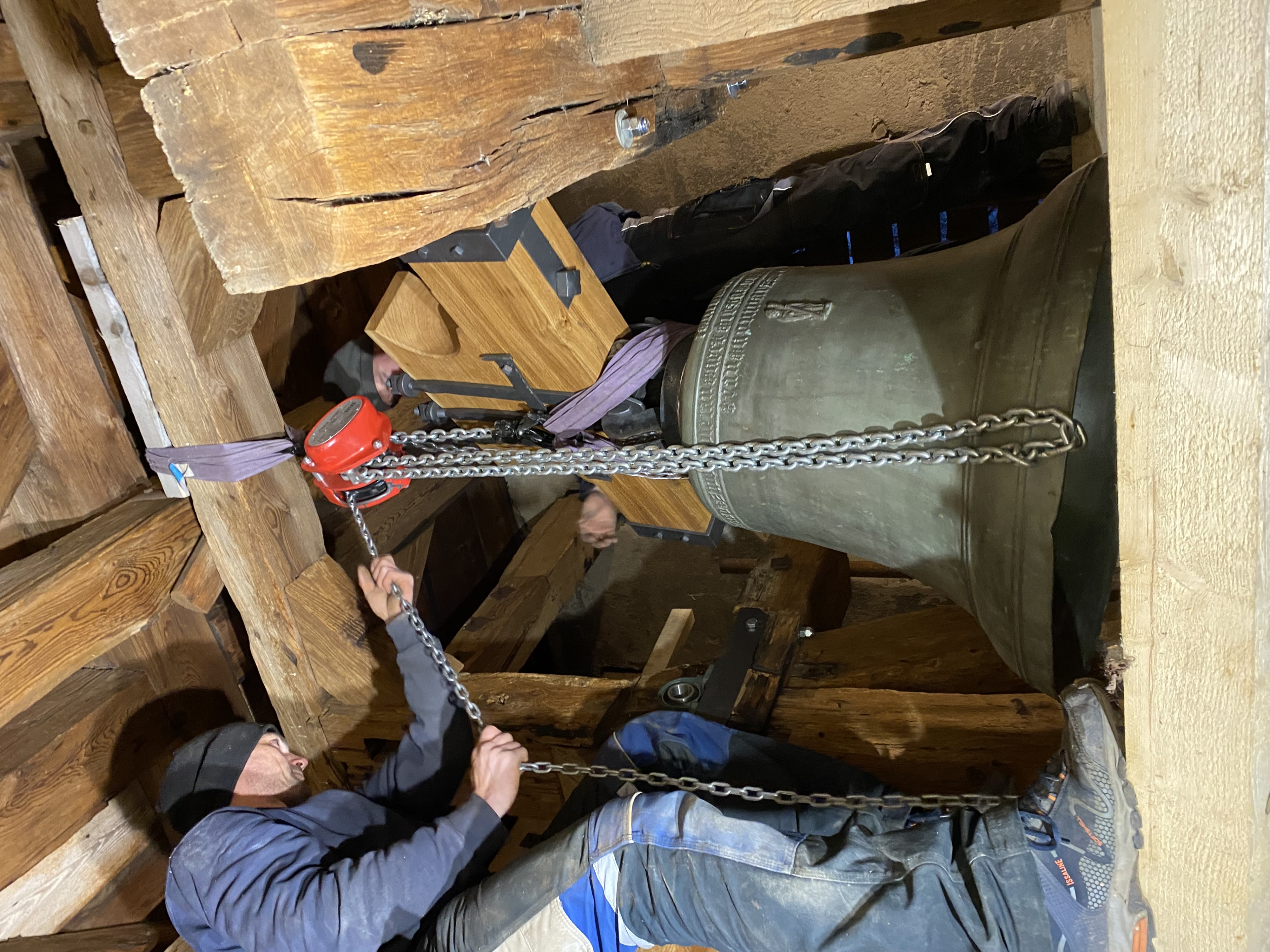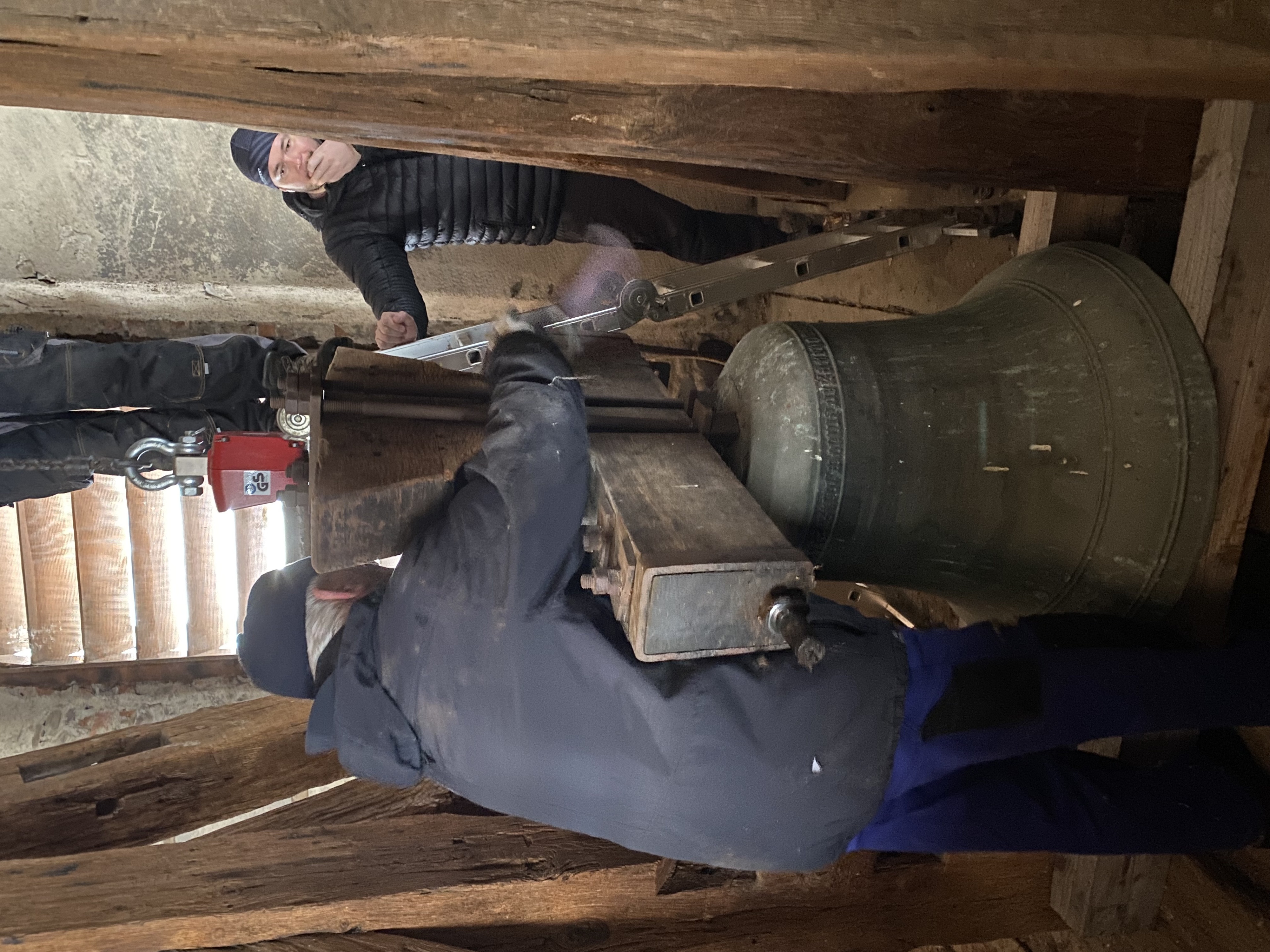 A-Opravený zvon se zdvihá na zvonovou stolici